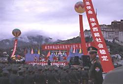 | All the programs finished in relaxing mood. All the soldiers were packed into the back of trucks and left the square. The tanks and armored cars, which sat on both sides of the stage, crept into the Beijing Road running in front of Potala, turned to the right at the corner of the Post Office and went away slowly to their base. | |