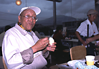 タシ・ツェリン氏の家はこれまで「ジョカン寺の前の広場のバルコル・カフェ並びの2階にあるチャン屋」というふうに説明してきました。住所は「Barkor Cafe 2nd floor, Lhasa, Tibet」でした。が、今年8月、バルコル・カフェ(という主に観光客向けのレストラン)が、なんと外資系のファーストフード店「ディコス」に変わってしまいました! タシ・ツェリンはお気に入りのようで、「旧社会では考えられなかった変化だ!」なんて言って嬉しそうに足しげく通っています。私も2度ほど一緒に行きました。(写真は、ディコスでソフトクリームを食べるタシ・ツェリン氏。ポタラ宮の見える席です) といった新しもの好きのタシ氏ですが、おいしいチベット料理が食べられる民家風レストラン最新情報も教えてくれて、ありがたかったです。 |